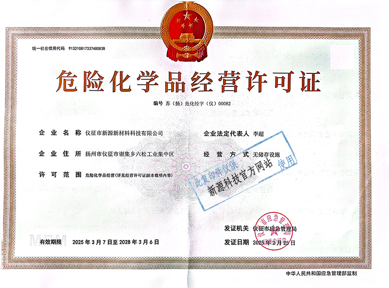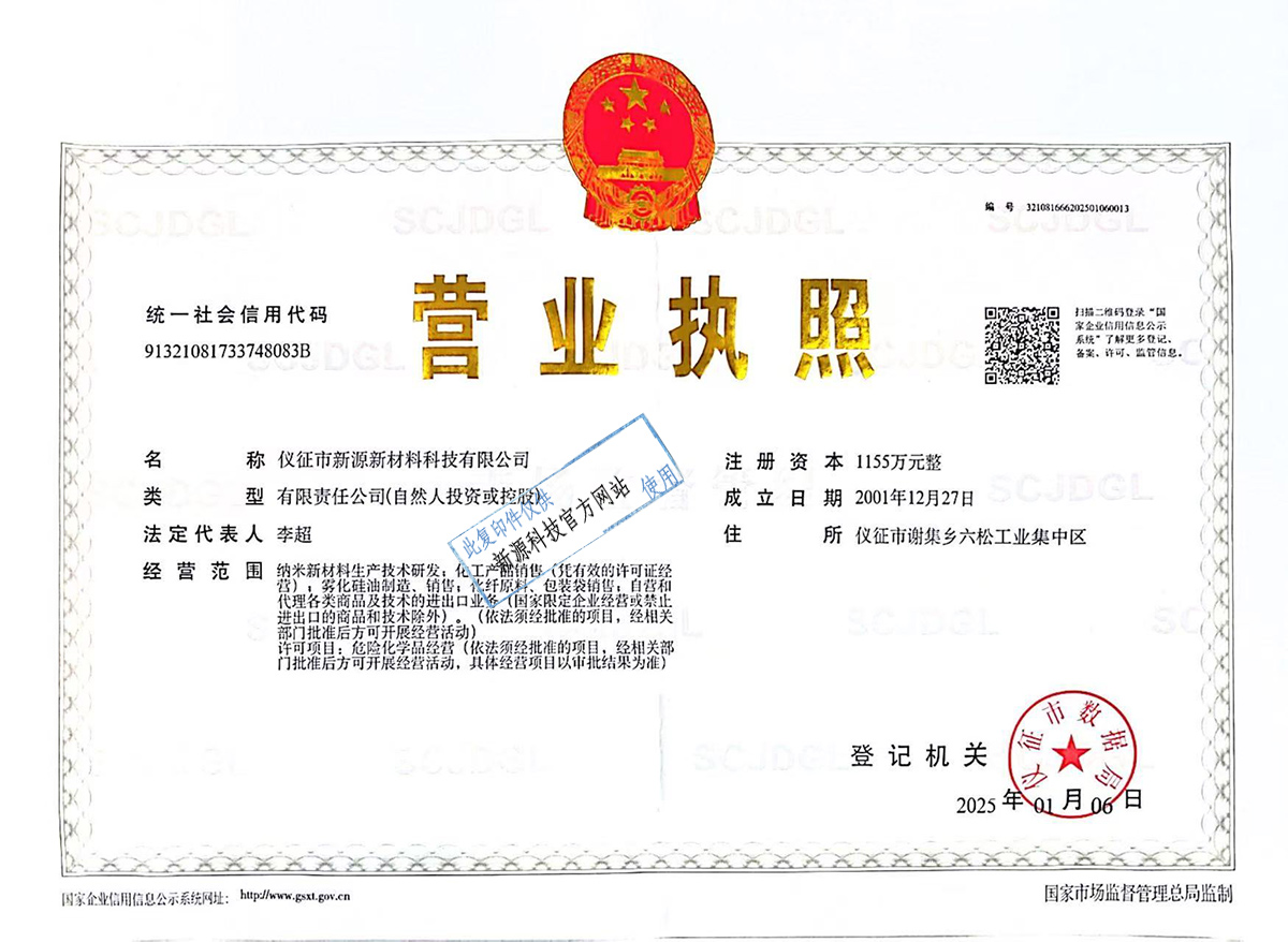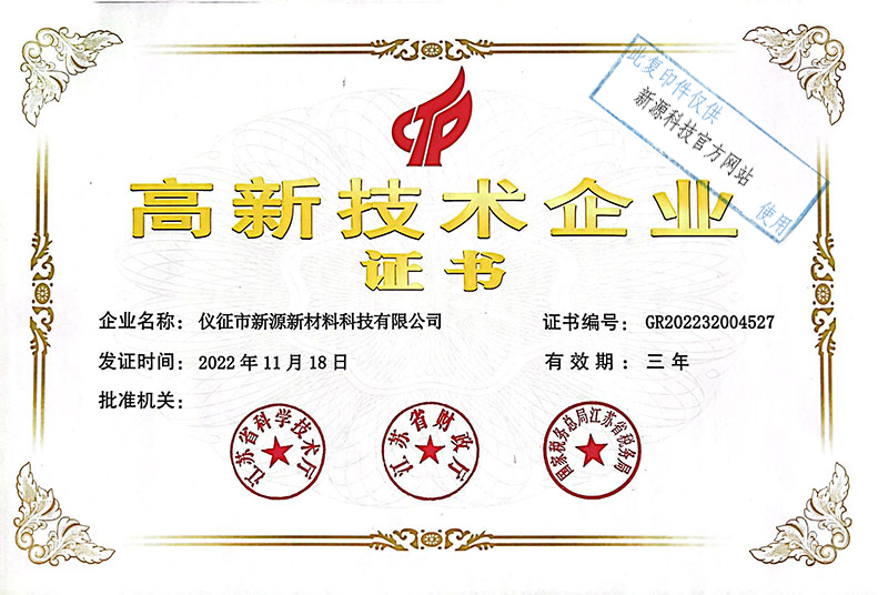 新源新材料科技通過了GB/T 19001-2016/ISO 9001:2015質量管理體系認證、GB/T 24001-2016/ISO 14001:2015環境管理體系認證和GB/T 45001-2020/ISO 45001:2018職業健康安全管理體系認證。具有技術研究和產品開發中心,20余項專利技術。“纖友牌”獲得揚州市知名商標稱號,企業獲得“儀征市先進企業”、“江蘇省民營科技企業”、“江蘇省省級高新技術企業”和江蘇省省級科技型中小企業”等稱號。